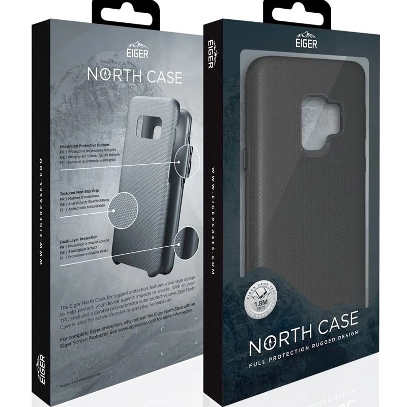 La surface robuste, texturée et antidérapante rend la coque très confortable, tandis que les boutons noirs intégrés sont faciles à utiliser. L’Eiger North Case a été conçu et testé pour résister aux chutes d’une hauteur de 1,8 m et les bords surélevés de la coque protègent l’écran.