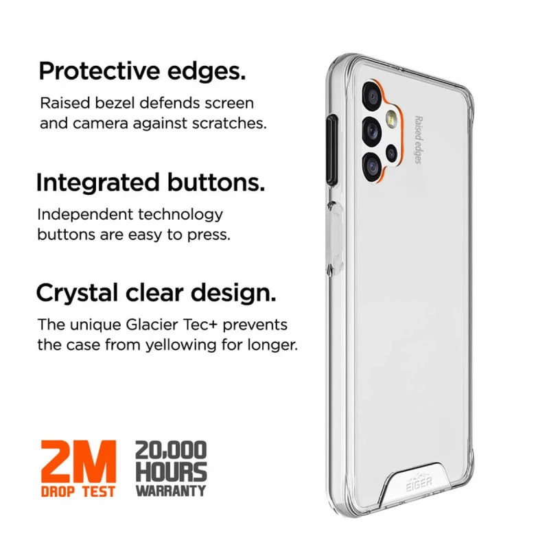 La coque EIGER Glacier Alpine Ice design pour une protection discrète et claire. La technologie Glacier Tec+ empêche la coque de jaunir plus longtemps et protège votre appareil des rayures. Associé à une technologie de boutons indépendants au design noir, cette coque donne du style à votre smartphone Samsung Galaxy A32 5G tout en lui offrant une protection robuste et efficace.